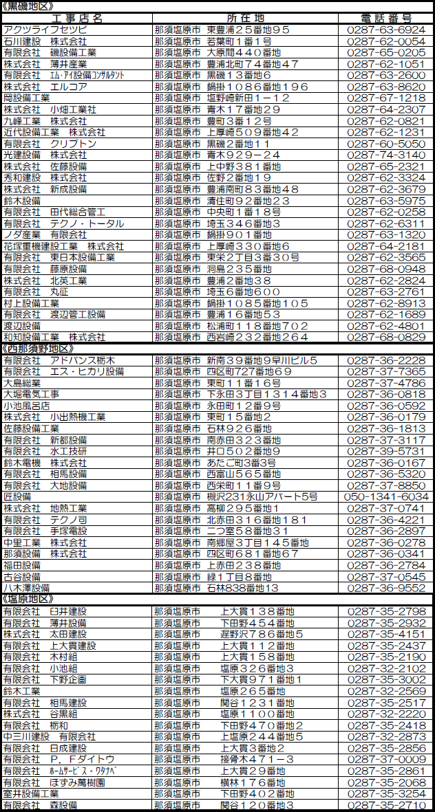 | 有限会社 小池組 | 塩原326番地3 | 0287-32-2102 |